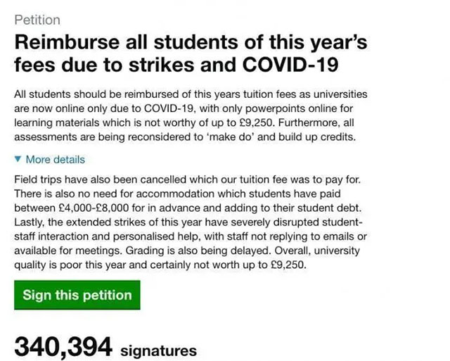 由于疫情迫使很多英國學(xué)校關(guān)閉,學(xué)生無法使用圖書館等設(shè)施,課程也都改成網(wǎng)課,留學(xué)生認(rèn)為自己支付的高昂學(xué)費(fèi)“打水漂”了,因此在英國議會網(wǎng)站發(fā)起聯(lián)名請愿,要求英國大學(xué)退還2019/2020學(xué)年的整年學(xué)費(fèi)和住宿費(fèi),目前已有超過34萬名學(xué)生加入了該請愿。