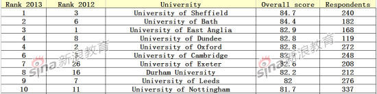 同時,在2014年的排名中躋身前10名的大學(xué)院校也包括從去年的26名上升至今年第7名的埃克塞特大學(xué)、杜倫大學(xué)(從16名上升至第8名)和諾丁漢大學(xué)(從11名上升至第10名)。